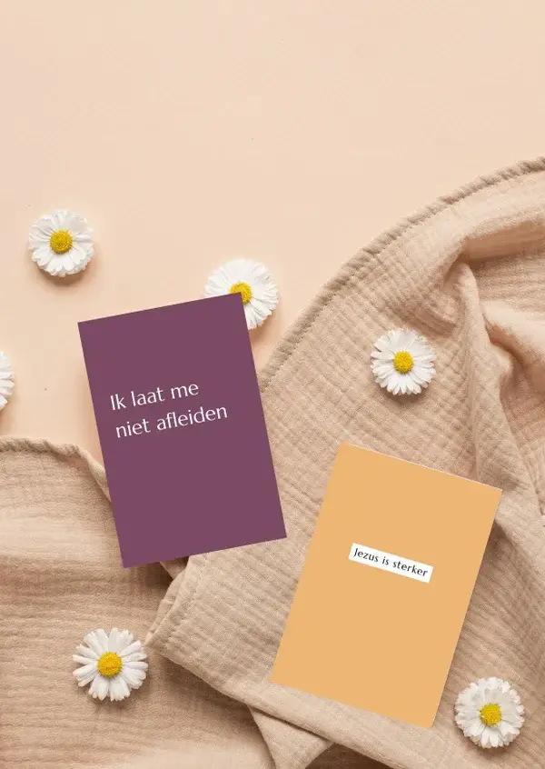 In onze gloednieuwe set vind je 40 affirmaties, Bijbelteksten en uitspraken, gedrukt op 20 dubbelzijdige, lekker stevige (300 grams) kaarten. Perfect voor je dagelijkse leven, zodat je jezelf steeds weer kunt herinneren aan de woorden van God. Om sterker te staan en je ogen op Jezus gericht te houden.