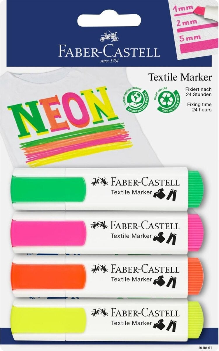 Set van 4 textielmarkers in opvallende kleuren: neon roze, neon groen, neon geel en neon oranje.