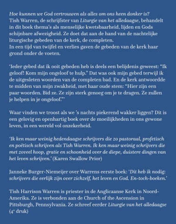 Hoe kunnen we op God vertrouwen, zelfs in het donker? Tish Warren, auteur van Liturgie van het alledaagse (3e druk, oktober 2020), verkent in haar nieuwe boek thema’s als menselijke kwetsbaarheid, lijden en Gods ogenschijnlijke afwezigheid. Ze doet dit door de nachtelijke gebeden van de kerk, de completen, als leidraad te nemen.