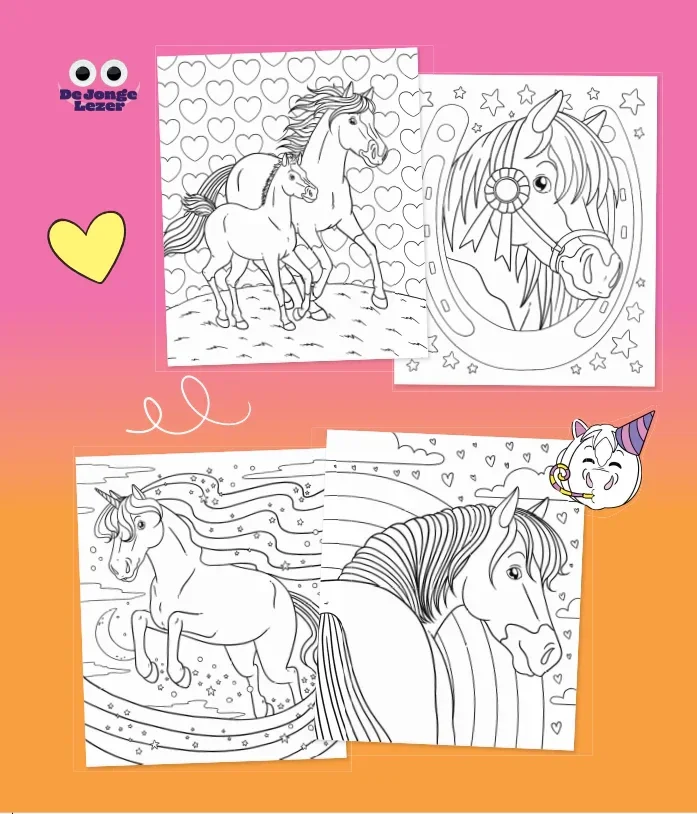 * 32 unieke kleurplaten met pony’s, paarden en unicorns.
